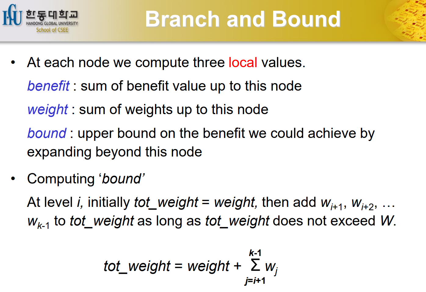 Tot_Weight은 여태까지 Knapsack에 집어넣은 W1 + W2 + .. 에서 시작을 한다. W4를 집어넣을 수 있으면 집어넣고 5번째 아이템을 집어넣을 수 있는 여유가 있으면 또 집어넣.... W, 집어넣을 수 있는 전체 용량을 벗어나지 않는 한에서 계속 집어넣는다. weight은 현재까지 집어넣은 Weight들의 합을 의미하고 그다음 wj는 앞으로 집어넣게 될 Weight들을 의미한다.
