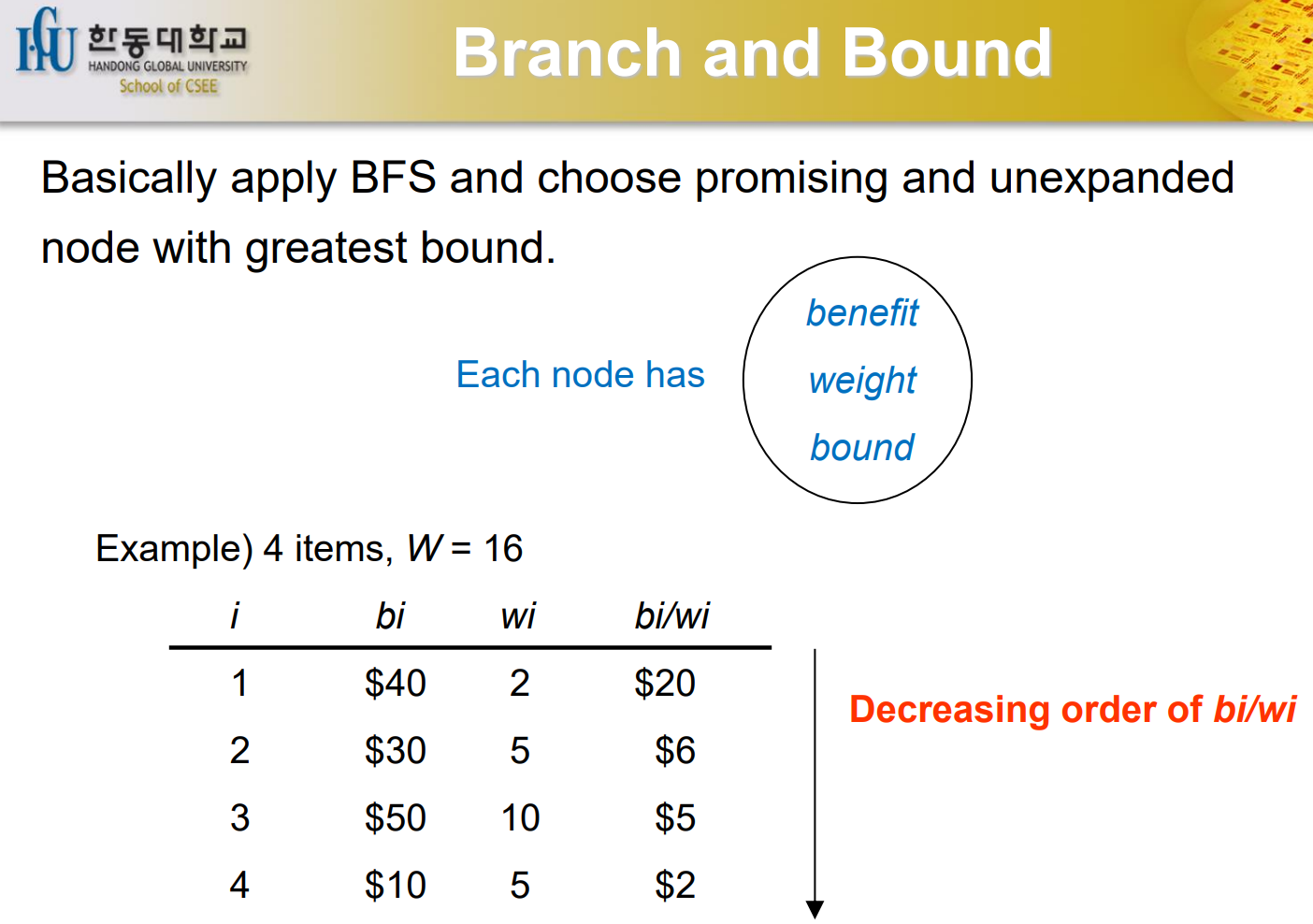 BFS와 유사하다고 볼 수 있다. 기본적으로 BFS를 apply한다. promising node와 non promising node를 계산하게 된다. 각 노드에서 benefit과 weight, bound를 계산하게 된다. 각각의 node마다 Bound가 계산되는데 가장 큰 Bound를 가진 노드를 중심으로 extand하게 된다. 단위 무게 당 Benefit이 가장 많이 나가는 것을 먼저 나오도록 sort를 한다.